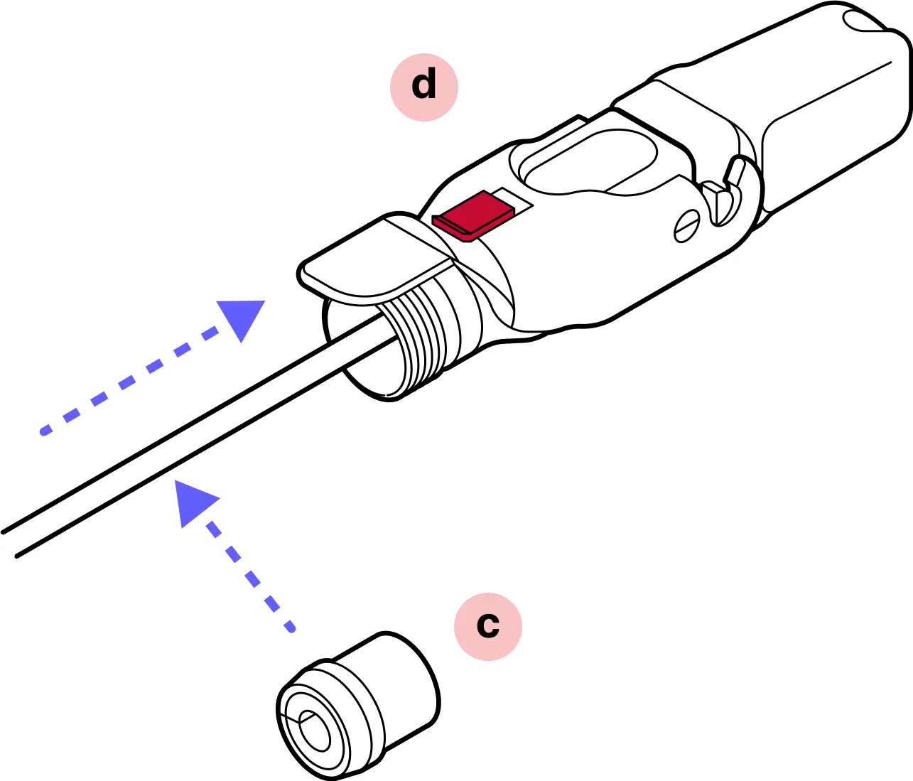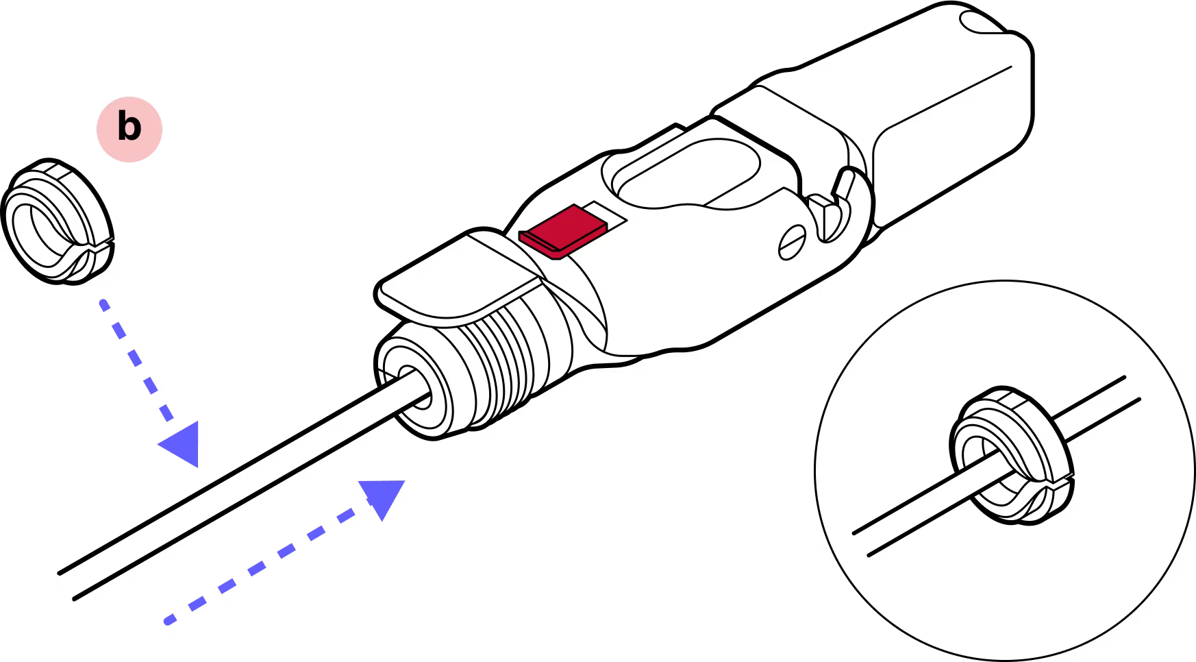 Slide the split rubber gland onto the cable and fit it snugly into the cylindrical portion of the Octis housing.