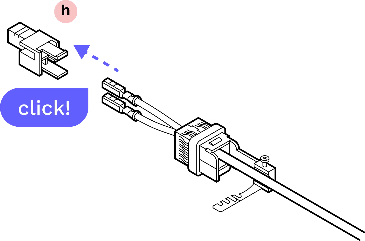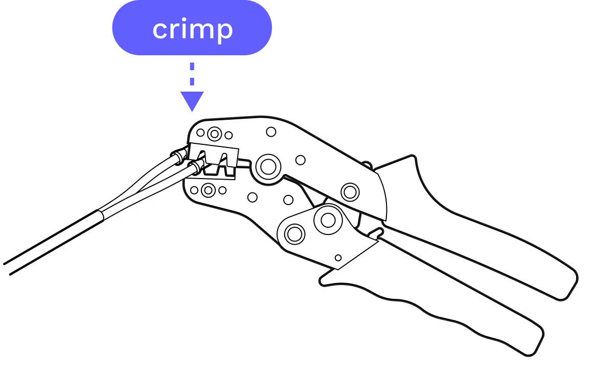 With the notch on the top of the crimp contacts and the plastic housing in the orientation shown above, slide the contacts into the housing until they click into place. It does not matter which color goes into which slot.