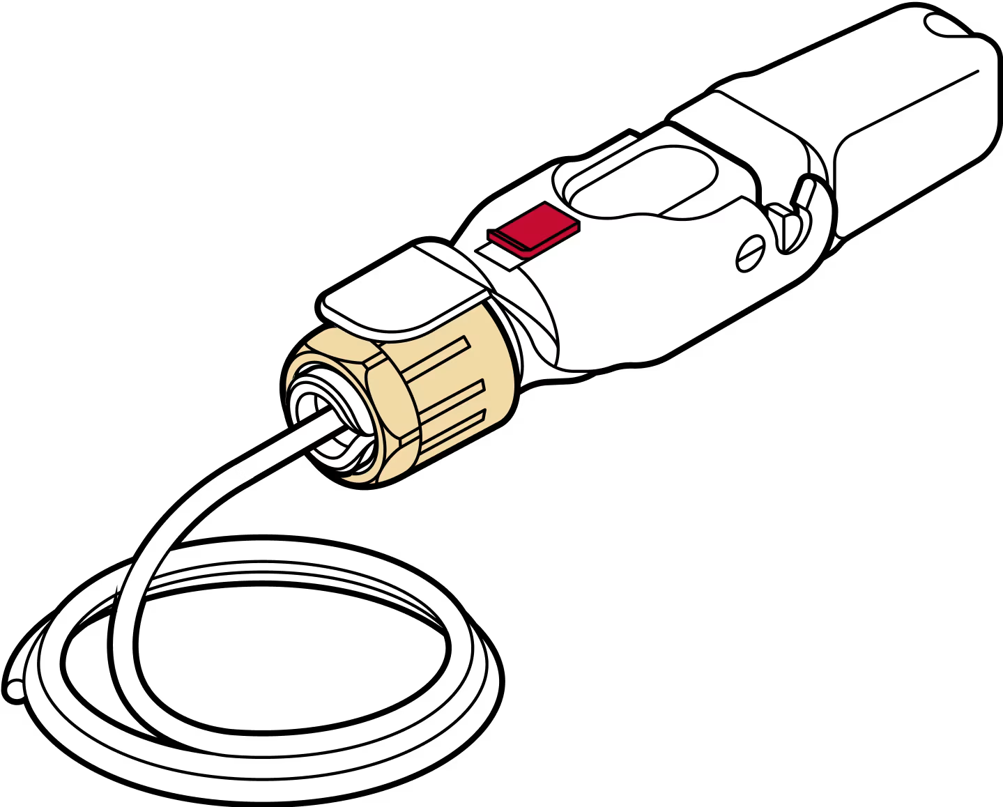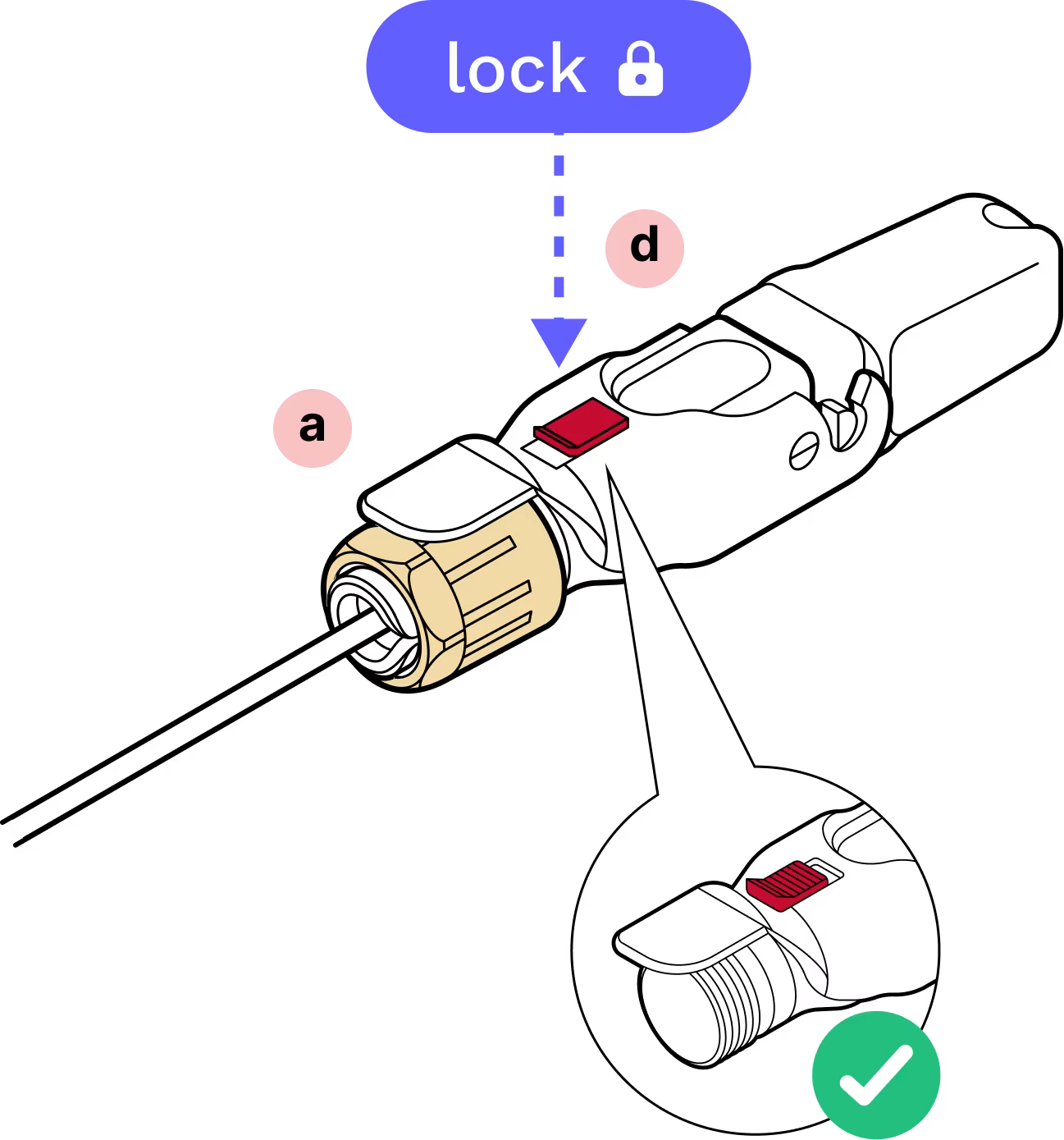 Open the hinge lock and tighten the yellow gland nut. Note that the red slide lock locks on the rim of this nut so it must be tightened enough to catch the red slide lock when in the locked position. DO NOT OVER-TIGHTEN.