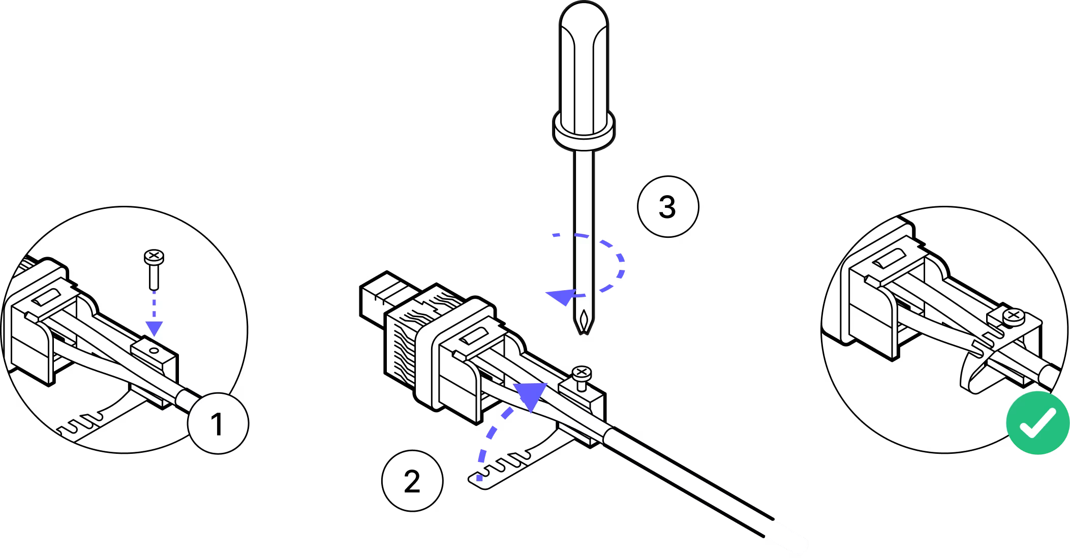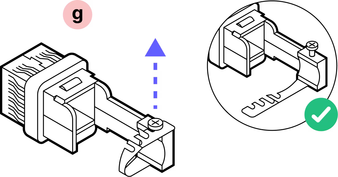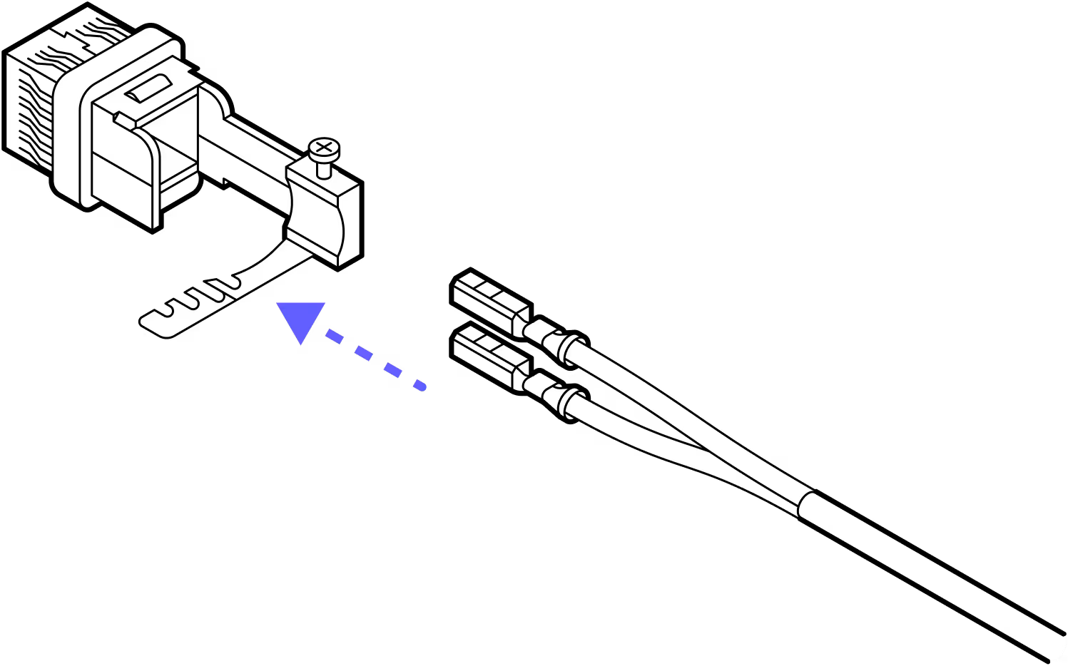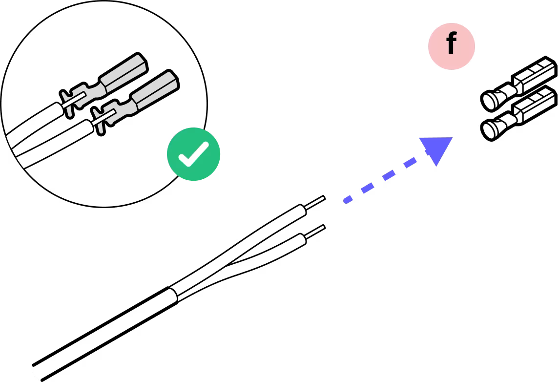 Back off the screw that holds the metal strap in place and uncurl the strap. Then slide the crimped contacts into and through the housing per the images in steps 8, 9, and 10.