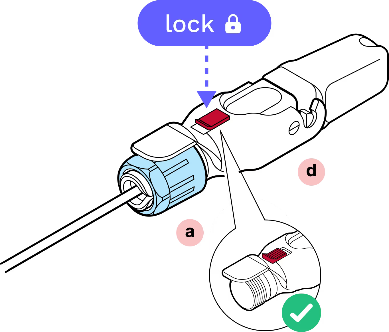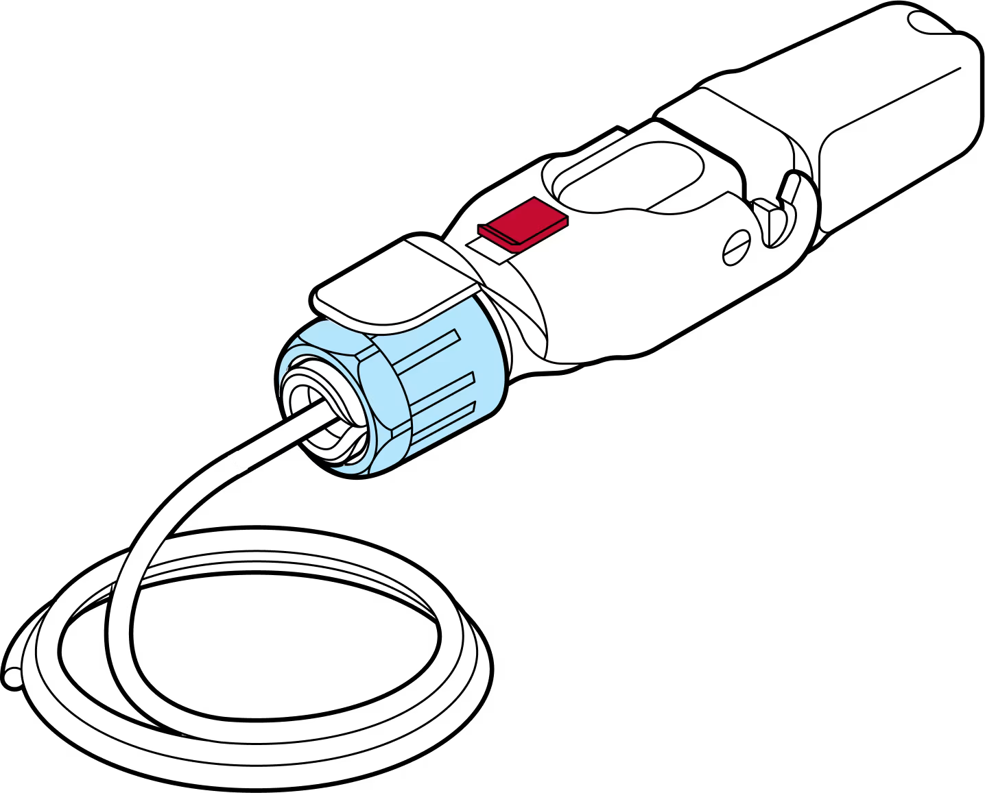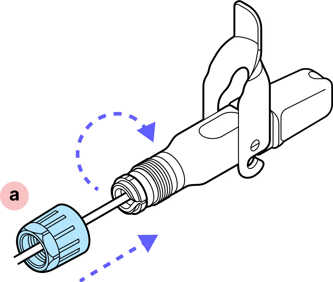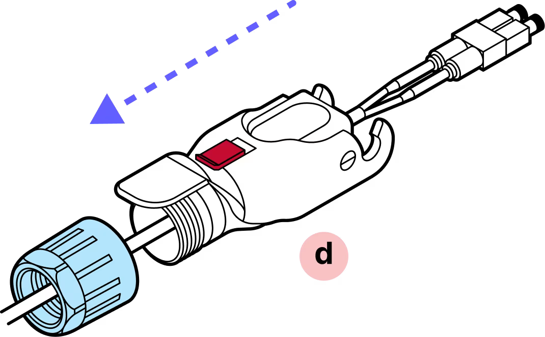 Screw the blue gland nut into place. IMPORTANT: The gland nut must be tightened so that the red slide lock catches on its edge when in the locked position. DO NOT OVER-TIGHTEN.