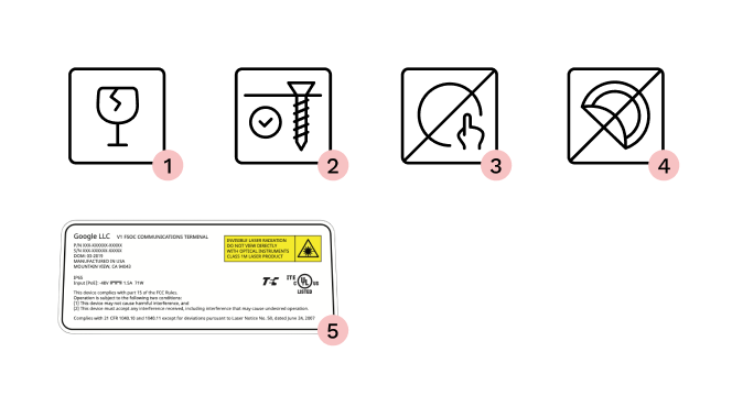 The labels on the terminal describe the regulatory compliance and manufacturing details (shown to the right). Do not remove these at any time.
