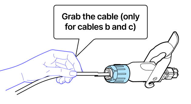 Commencez par l’un des connecteurs fibre (capuchon bleu). Pour les connecteurs DC (jaune) et RJ45 (noir), il est important de pousser depuis le câble, et NON depuis le boîtier en plastique.